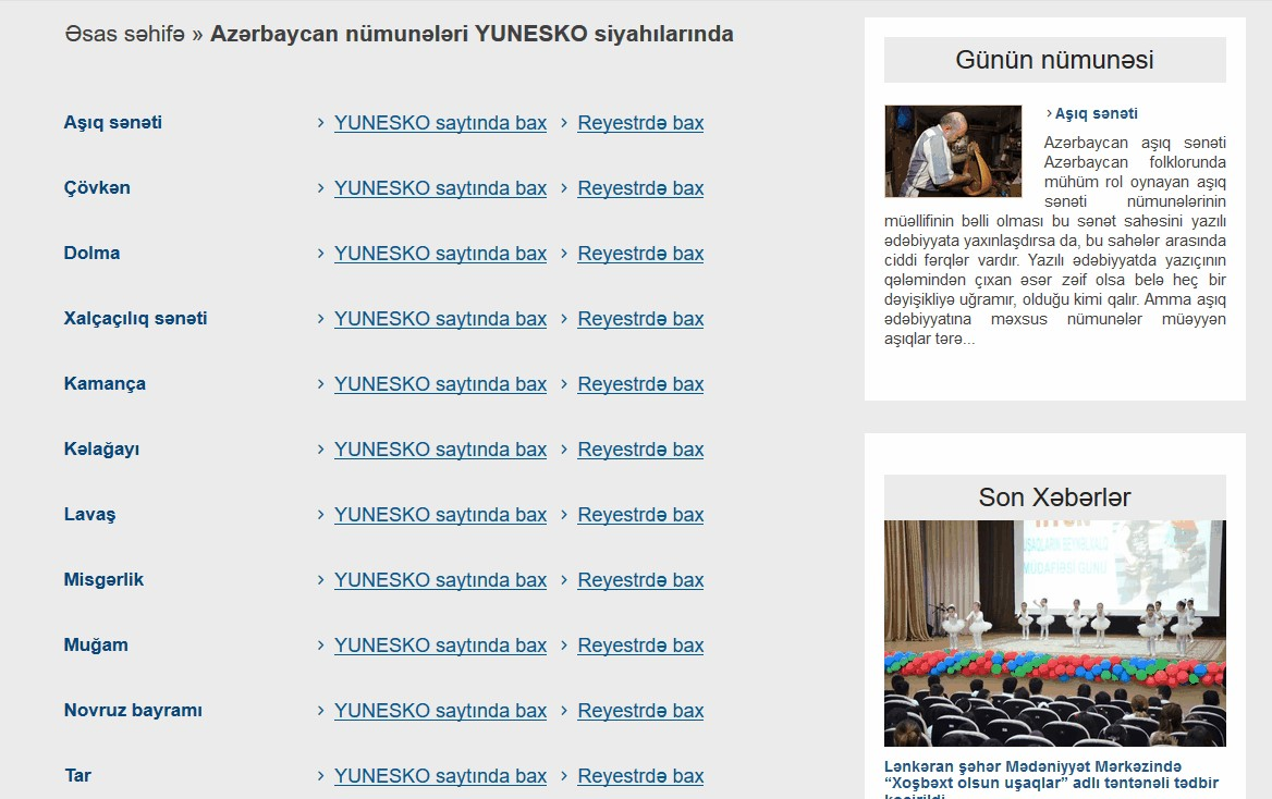 Saytın “Sənədlər” bölməsində mədəniyyət sahəsində qəbul olunmuş milli normativ-hüquqi aktlar və Azərbaycan Respublikasının qoşulduğu beynəlxalq normativ-hüquqi aktlar, “Azərbaycan nümunələri YUNESKO siyahılarında” səhifəsində isə YUNESKO-nun Reprezentativ siyahısına daxil edilmiş Azərbaycanın qeyri-maddi mədəni irs nümunələri öz əksini tapmışdır. “YUNESKO siyahılarında bax” və “Reyestrdə bax” ifadələrindən birini seçməklə həmin nümunələrin müvafiq saytlardakı səhifələri ilə tanış olmaq mümkündür.